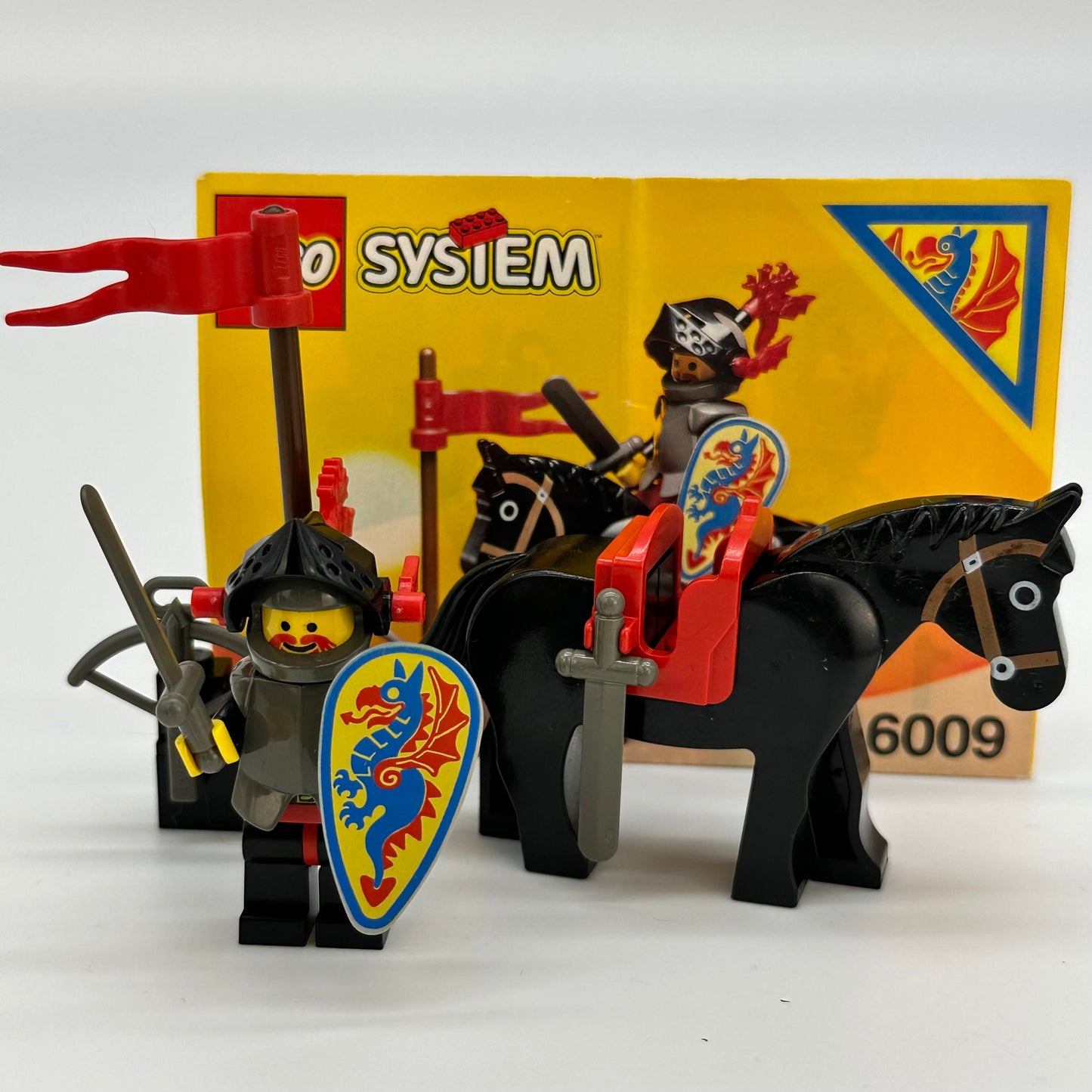 LEGO® 6009 Black Knight is a 24 piece Castle set with 1 minifig released in 1992. It features a knight minifigure, a horse, two swords, an oval shield, a dragon plume, visor dragon wings, a weapon rack, a lance, and a crossbow.